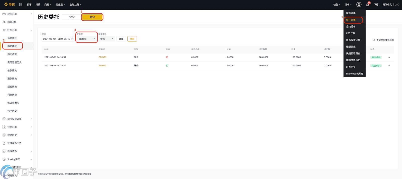 选择【逐仓】,可按“时间”、“交易对”(如ZILBTC)和“买卖类型”过滤交易对,查看历史委托订单。