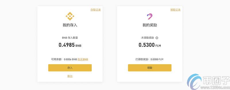 6.在【我的存入】下,可用余额代表您的现货账户内可用资产。此外,您还可以选择购买对应数字货币。单击【存入】,即可选择存入BNB来进行FLM挖矿。右侧【我的奖励】将会显示您的未领取奖励收益。在【领取记录】下,您可以查看您的奖励领取及分发的历史记录。