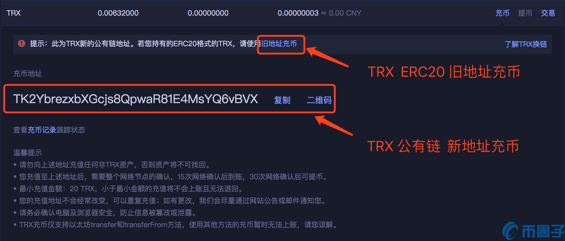 什么是TRX换链?TRX换币通道,即TRX的充币地址将有两个。如您持有TRX旧币(基于以太坊ERC20技术形成的“TRON”),您需点击“旧地址充币”查看充币地址;如您持有TRX新币(基于TRX主链形成的“TRON”),您可直接点击“充币”按钮后查看。