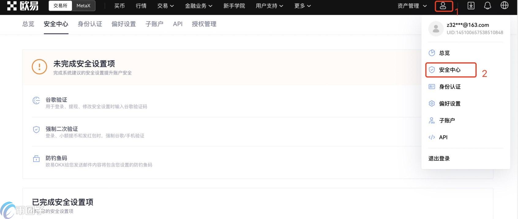 4.安全设置:打开欧易官网,在页面右上角点击【个人**】—【安全**】,即可进入安全设置页面,您可以在此页面进行登录密码和资金密码的修改以及邮箱验证、谷歌验证、防钓鱼码等设置,个人信息设置的越完善,越能够保障您的交易和账户安全。