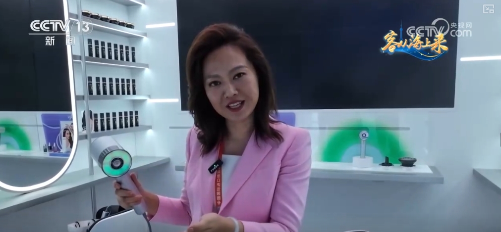 洗完泡**,需要吹干头发,上个“黑科技”。第三个关键词科技。这是进博会首秀的一款拥有150项专利的光能吹风机,原理就是利用红外光导热,精准定位水分子,快速吹干的同时,还能保留头发内在水分,帮助改善发质。一键连接手机小程序,自定义风速和温度都能,满足个性化需求。