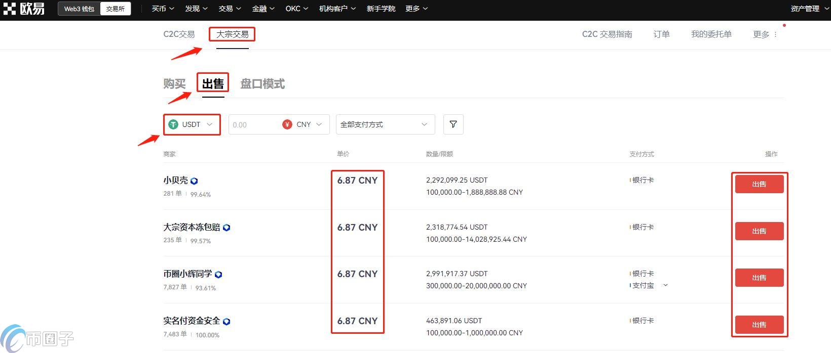 7.选择【大宗交易】——【出售】可以根据需求选择出售金额,付款方式,选择合适的商家后,点击商家右侧的【出售USDT】根据提示进行操作即可