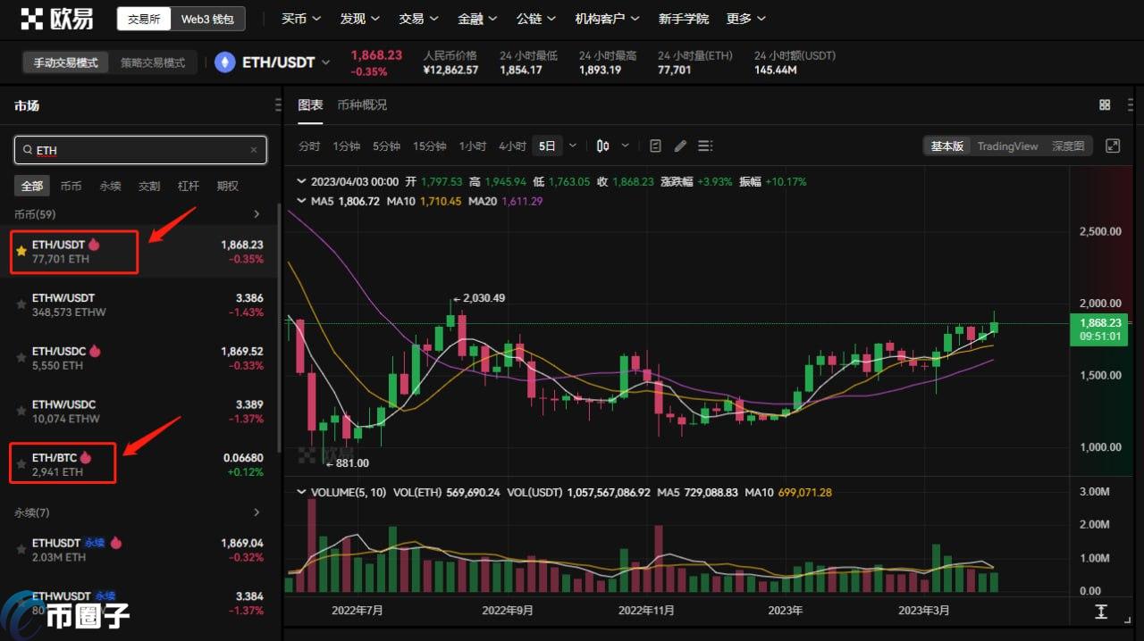 用BTC买币就是BTC交易对,用USDT买币就是USDT交易对,例如:在欧易交易所(没有账号的投资者可以点此注册新账号)搜索ETH时可以看到,下方出现的ETH/USDT就是使用USDT购买ETH、ETH/BTC就是使用BTC购买ETH。