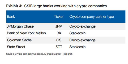 根据Morgan Stanley四月发布的《Who is Still Banking Crypto Companies?》报告,纽约梅隆银行也是美国4家有与加密产业合作的GSIB(系统重要性金融机构)之一。