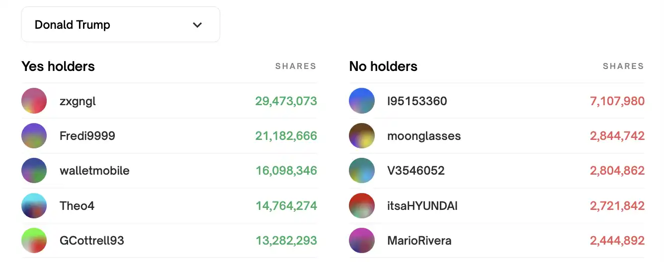 下图展示了在 Polymarket 上用户对特朗普是否当选总统的**份额分布。左侧的「支持者」表示认为特朗普会当选的用户,其中**持有者「zxgngl」持有 29,473,073 份股份,目前总盈利达 1131.5 万美元。其他主要支持者包括前文提到的「Fredi9999」和「walletmobile」。