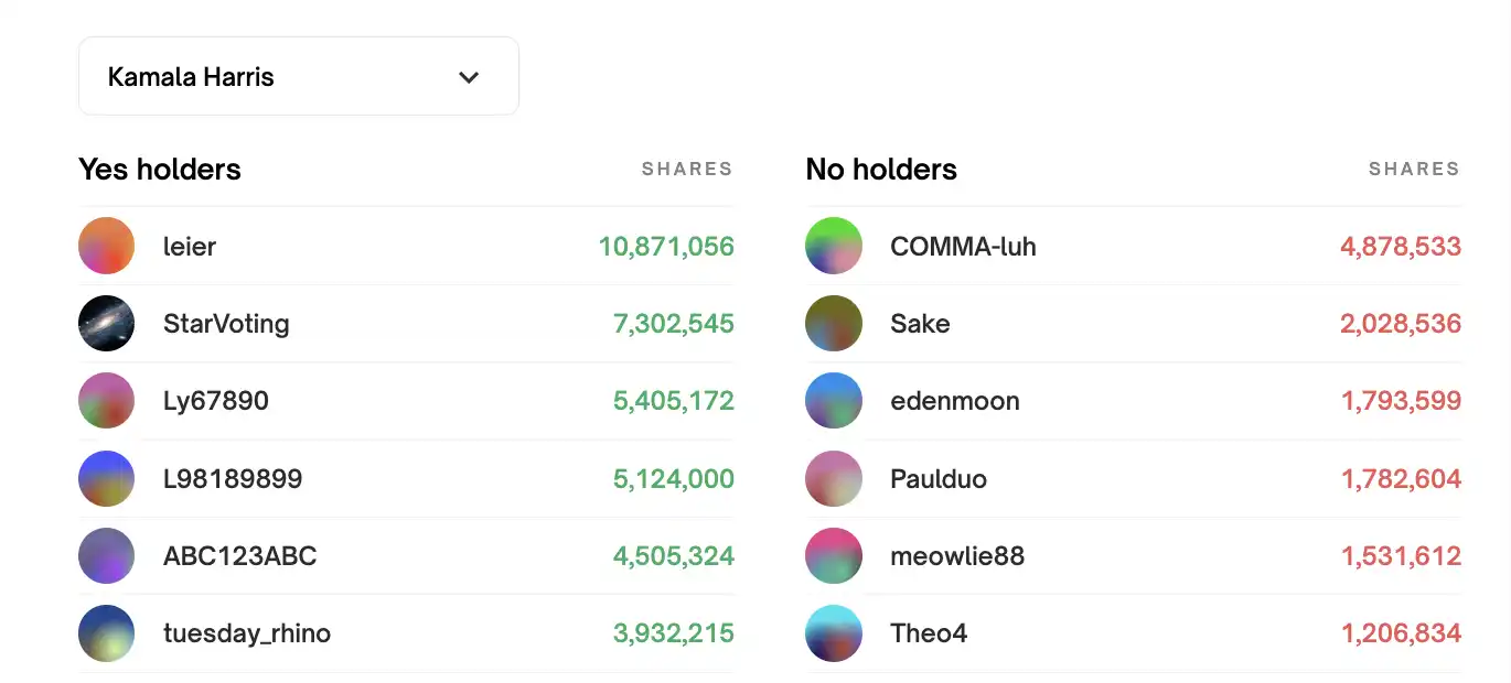 下图是 Polymarket 上用户对哈里斯是否当选总统的**份额分布,左侧的「支持者」表示那些认为哈里斯会当选的用户,其中**持有者「leier」持有 10,871,056 份股份,目前该用户的总亏损金额已达 499 万美元。其他主要支持者包括「StarVoting」和「Ly67890」。