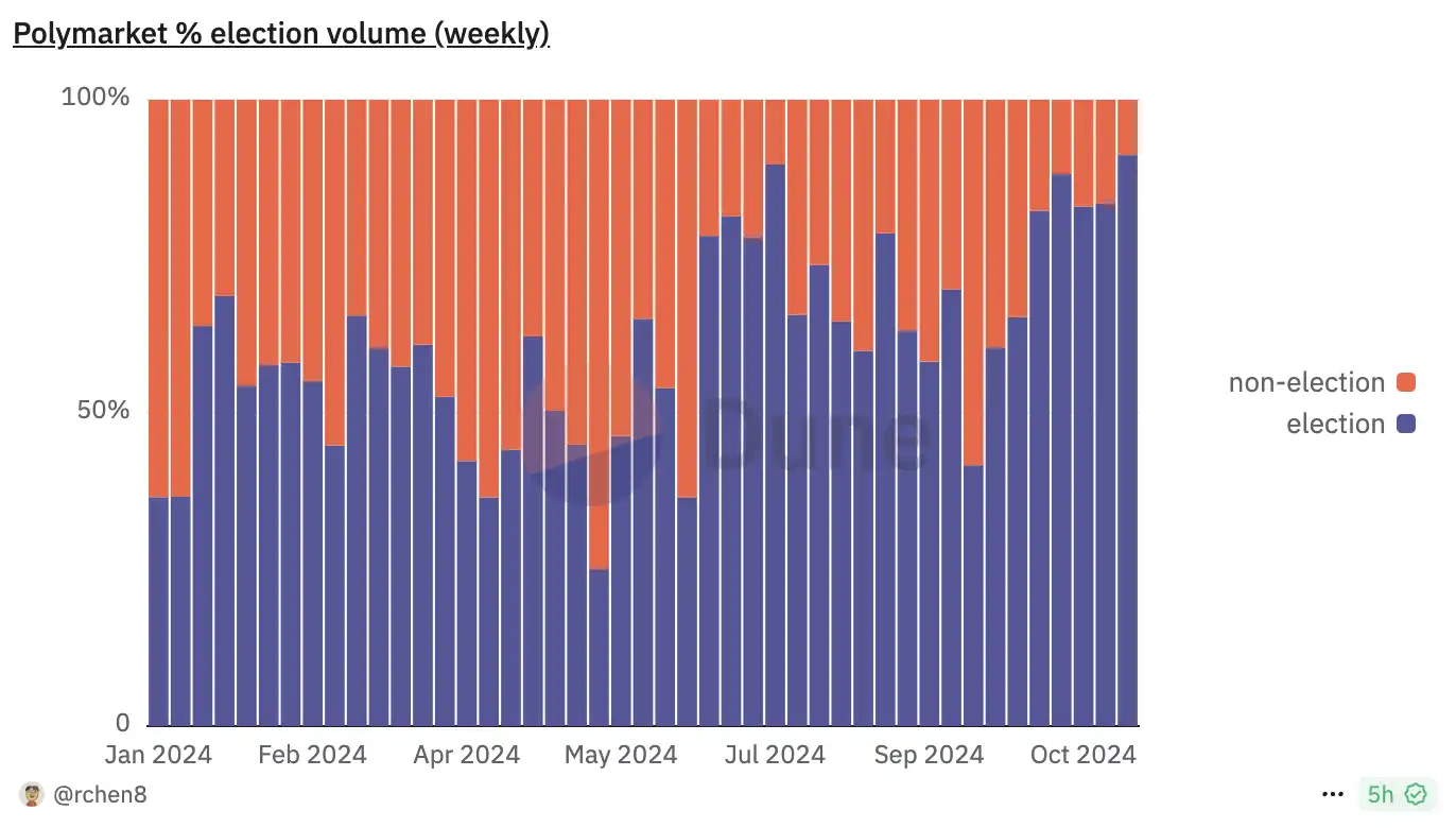 在今年整个大选行情期间,币圈最出圈的应用除了 Pump.Fun 应该就是预测市场 Polymarket。由于 Polymarket 在大选期间极佳的运营,再加上特朗普和一些 KOL 的带货,「Polymarket 上能押谁是下一位总统」这个定位被迅速传播。总统相关的交易量随着大选之夜临近不断被拉升,直到 11 月 6 日中午,由于太多人涌入 Polymarket 网站,导致其服务器曾出现短暂崩溃。