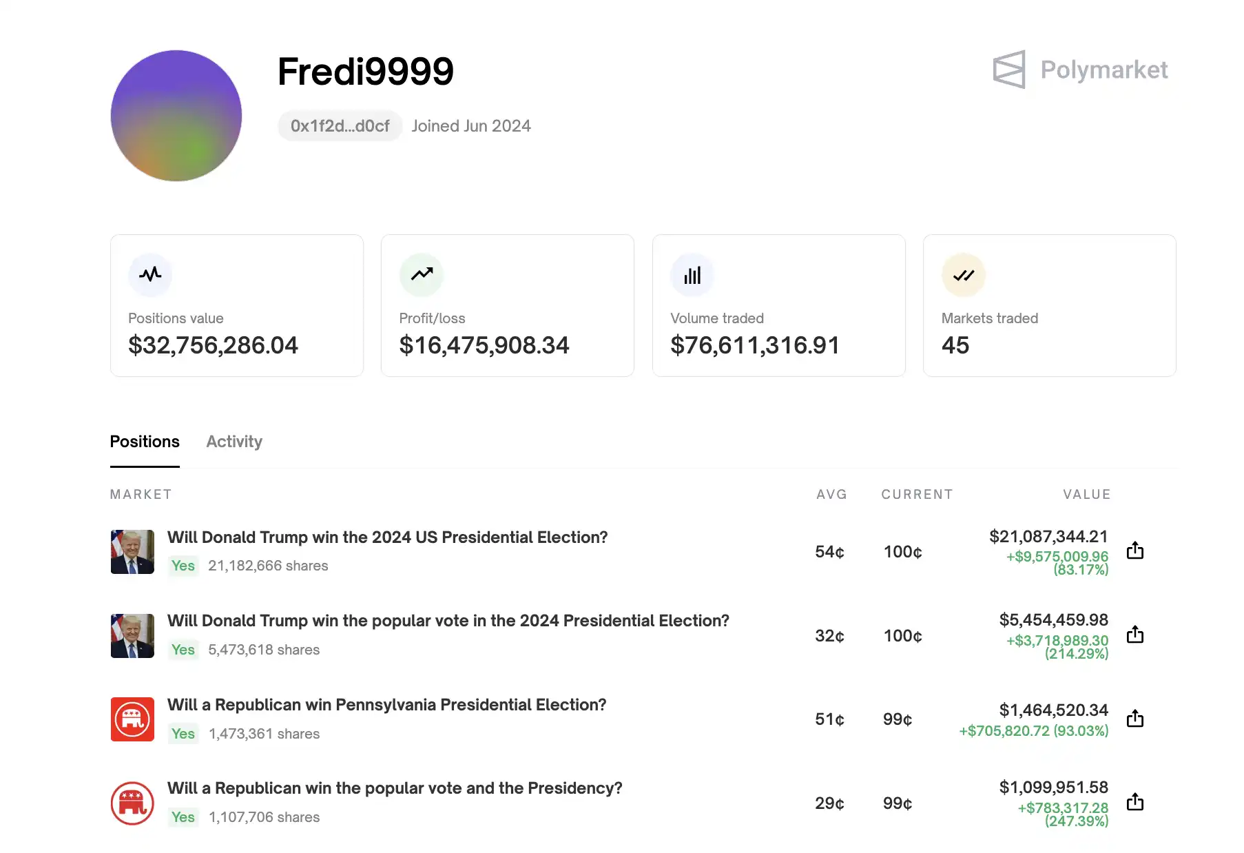 今日,大选结果终于揭晓,Théo 的其中一个账号 Fredi9999 总盈利已达 1647 万美元。