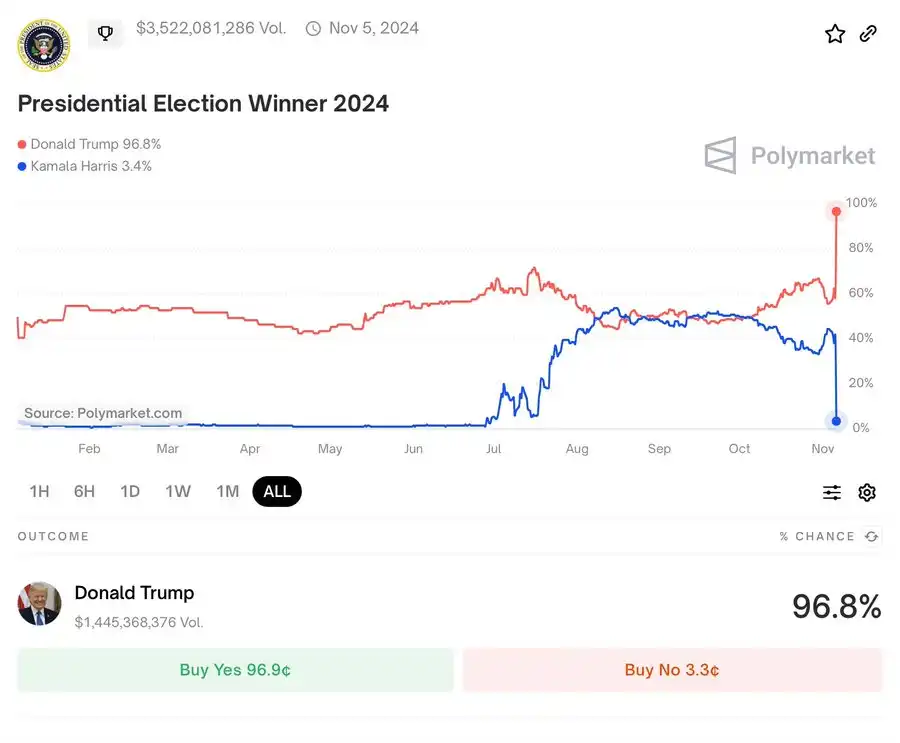 Polymarket 上的有关大选的预测交易目前累计交易量已达$3,612,184,597 美元,共和党候选人特朗普相关的交易在 Polymarket 上的交易量接近 14.8 亿美元,民主党候选人哈里斯的交易量为 10.1 亿美元。