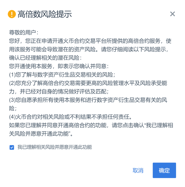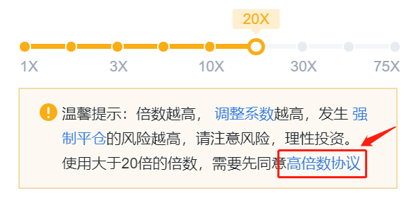 8、永续合约目前**支持125倍数,如用户使用大于20倍以上的高倍数需要先阅读并同意《高倍数协议》,根据情况选择杠杆倍数。