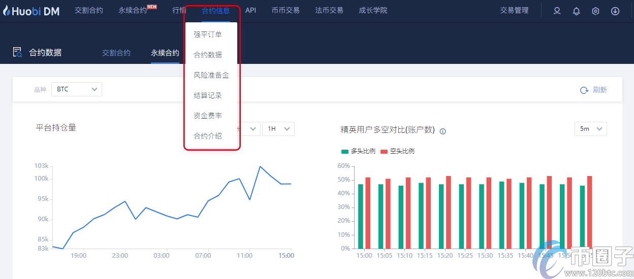 11、鼠标移动到导航栏“合约信息”,即可查看“结算记录”、“风险准备金”、“资金费率”等信息。