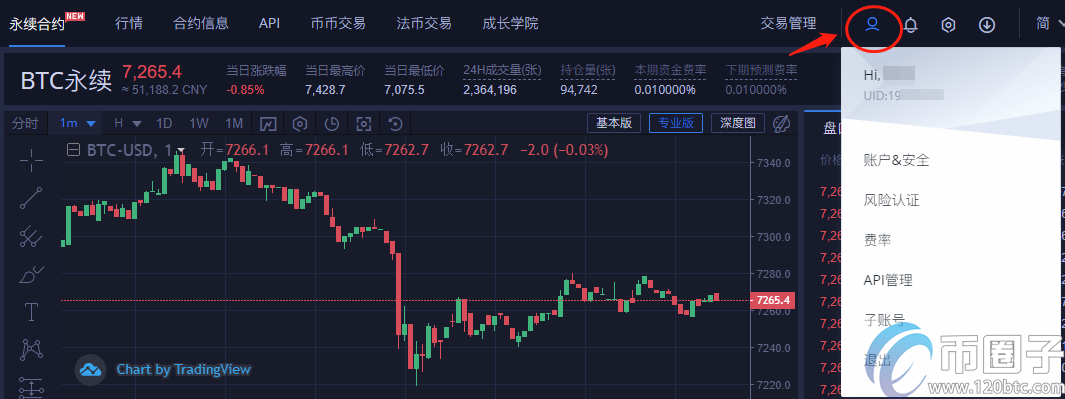 4、完成开通永续合约后,在导航栏右上方即可查看账户UID、账户&安全、费率等信息。