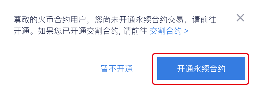 2、在弹出的未开通合约交易提示,点击“开通永续合约”,进入永续合约开通页面。