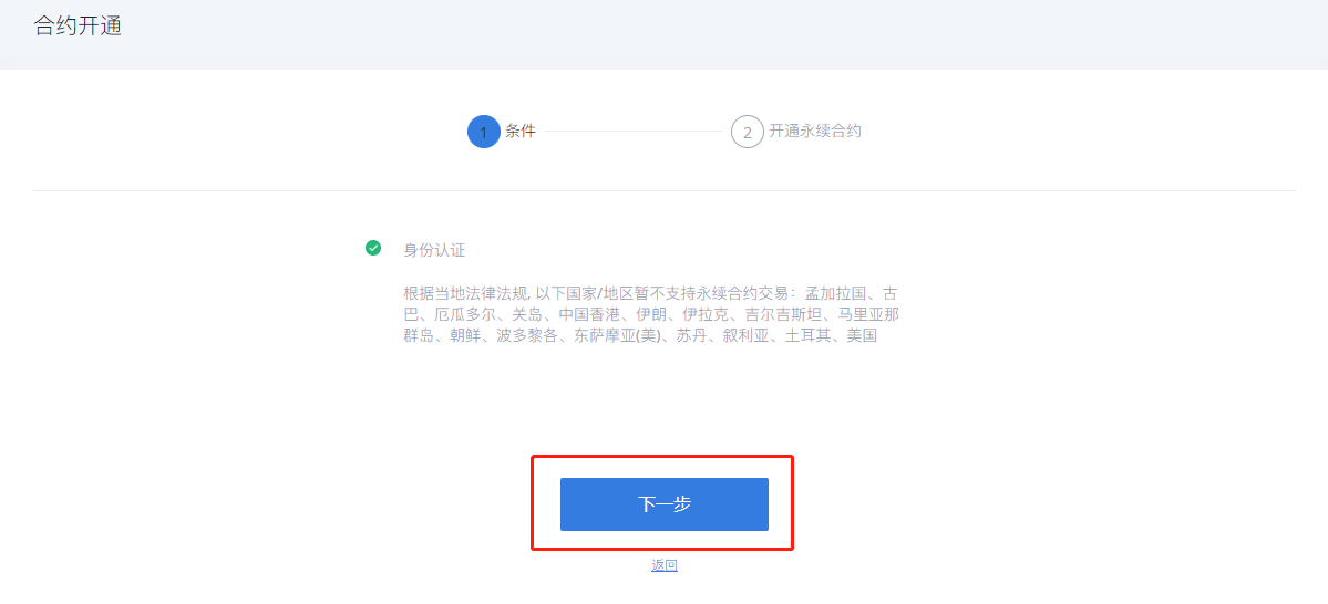 3、在永续合约开通页面,未完成身份认证要先进行身份认证,认证完成后点击“下一步”进入用户服务协议页面。同意协议后点击“确认并开通”,则成功开通合约交易。