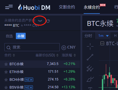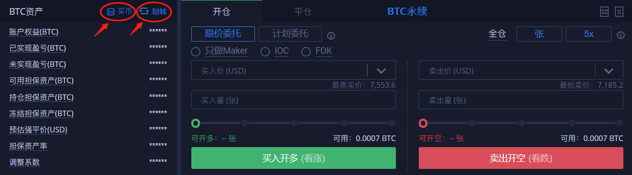 6、划转完成后就可以在交易页面左上方看到折合成BTC的总权益,然后就可以进行永续合约交易了 (点击小眼睛可以隐藏用户资产信息) 。