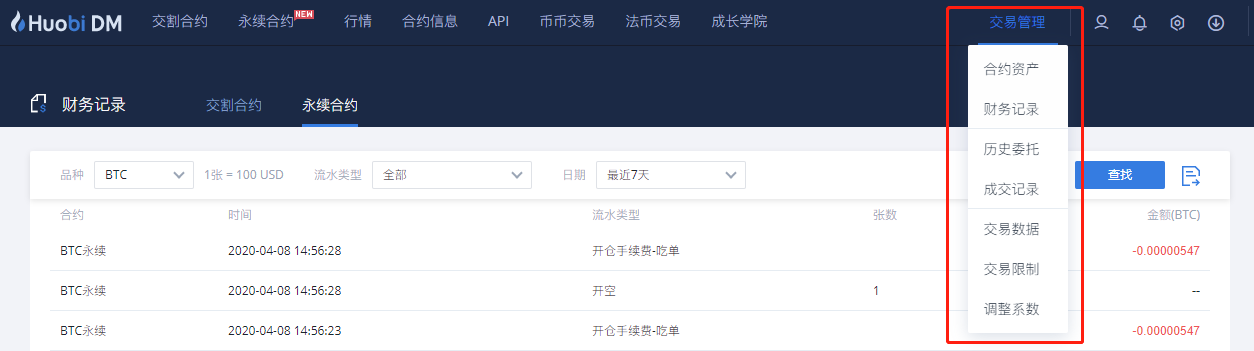 12、鼠标移动到页面顶部导航“交易管理”,即可查看 “财务记录”、“历史委托”、“成交记录”等交易数据。