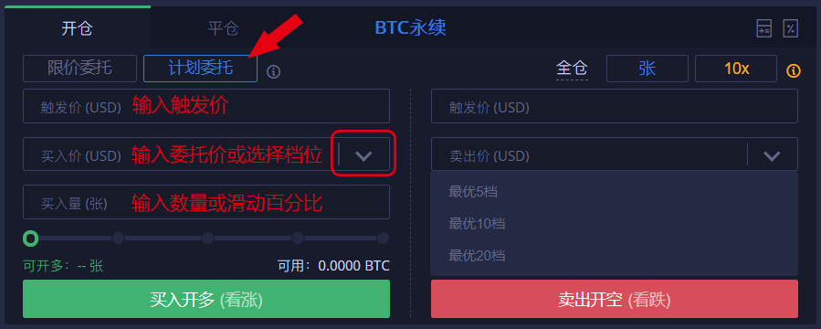 选择倍数后,可使用“限价委托”或“计划委托”开仓,看涨则选择“买入开多”,看跌选择“卖出开空”。