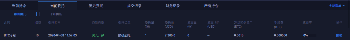 限价委托:用户需要自己指定下单的价格和数量。限价委托规定了用户愿意买的**价格或愿意卖的**价格。用户在设定限价后,市场会以达到对用户有利方向的价格优先成交。开仓和平仓都可以使用限价委托。限价委托可选择三种生效机制,“只做Maker(Post only)”、“**成交或立即取消(FillOrKill)”、“立即成交并取消剩余(ImmediateOrCancel)”;当不选择生效机制时则限价委托默认是“一直有效”。