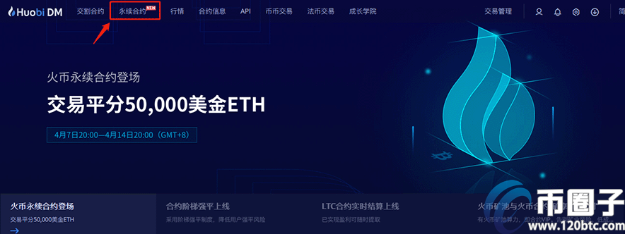 登录火必官网(点此注册),找到“永续合约”,点击进入。