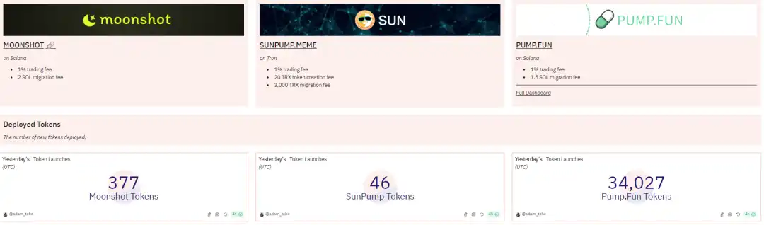 在发射机制方面,Moonshot 相较于 pump.fun 的主要改进在于支持不同外部 DEX 的初始池子添加,以及在初始打满市值时有所差异。除此之外,两者在其他方面的区别并不显著。至于 Sunpump,其整体机制与 pump.fun 相似。由于行业普遍遵循「first is first」原则,即便通过**空投等激励手段吸引用户进行吸血鬼攻击,新进入者也很难实现大幅度超越。接下来,我们结合 dune 的数据来深入了解 pump.fun、Moonshot 和 Sunpump 的数据表现,以评估它们在市场中的表现和竞争力。