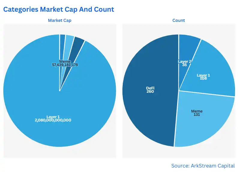 市值和数量变化:Meme 的市值和流通数量的变化可以反映市场对其的需求和接受程度。尽管部分 Meme **虽然市值不高,但新增 Meme 数量表明了社区对整个板块的兴趣在增长。相比于其他板块(Layer1/Layer2/DeFi),Meme 在近两年的板块总市值、新增数量等方面都是远远**。