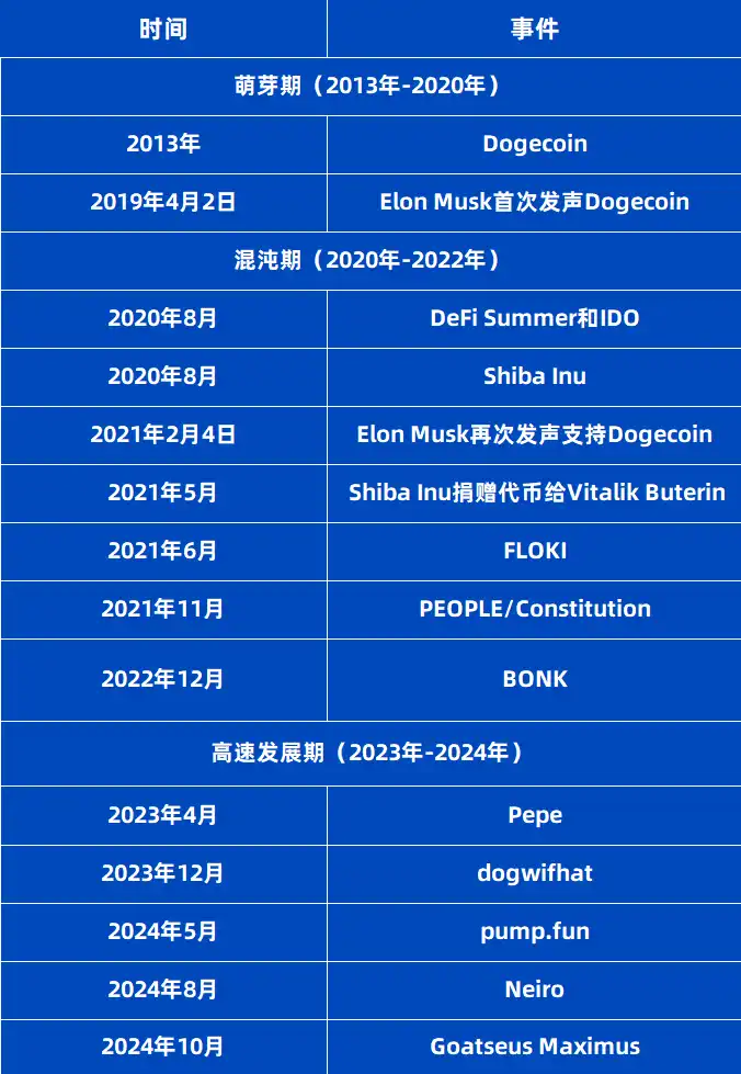 1、Meme 经历了 2013 年至 2019 年的**萌芽阶段,随后 2020 年至 2022 年快速变化的混沌时期,终于在 2023 年至 2024 年迎来飞速的发展时期,并正式作为单一赛道获得了广泛的认可和受众基础。