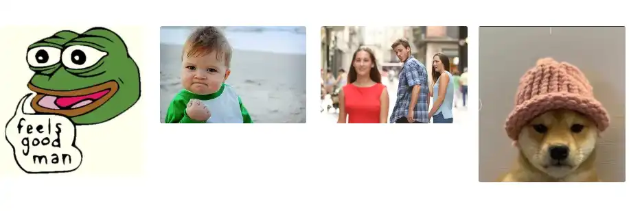 1、动物类 Meme:以动物形象为基础,通过幽默文字表达情感或观点,因可爱和亲和力而受到广泛喜爱。最知名的无疑是狗狗的 Dogecoin、青蛙的 Pepe 等。