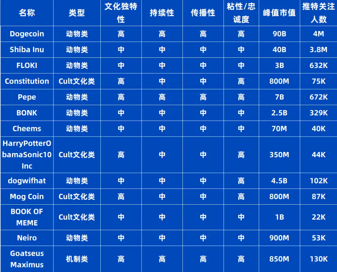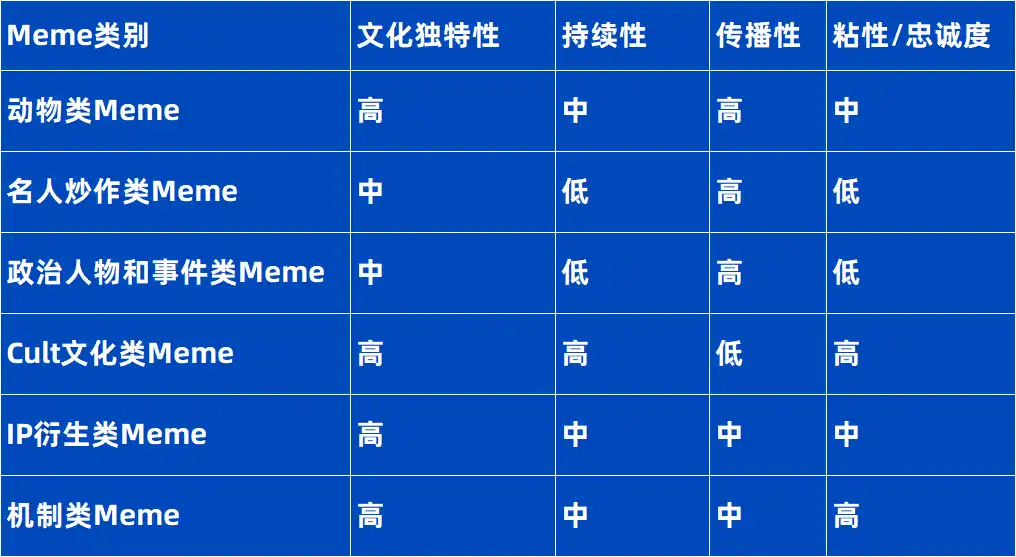 Meme 在不同类别中展现出独特的文化特色和受众基础,这影响了它们的持续性、传播性和对社区的粘性。在这些类别中,动物类 Meme 和 Cult 文化类 Meme 因其深厚的文化根基和忠实的粉丝群体,我们认为是适合长期关注的类型。相比之下,其他类别的 Meme 往往与短期热点相关,它们的关注度和流行度可能会迅速上升然后回落。为了快速识别并理解各种 Meme 的核心特征,我们提供了以下评估框架。