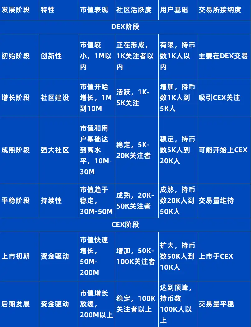 Meme 的生命周期具有不可预测性,其存活时间可能短至几分钟,也可能长至数年。对于能够经受时间考验并持续流行的 Meme,它们通常会经历几个不同的发展阶段。我们以 DEX 和 CEX 为界,概述了 Meme 从 DEX 的早期阶段到 CEX 的成熟阶段的基本演进过程。在这一过程中,Meme 的市值和社区规模等关键指标会表现出显著的变化。