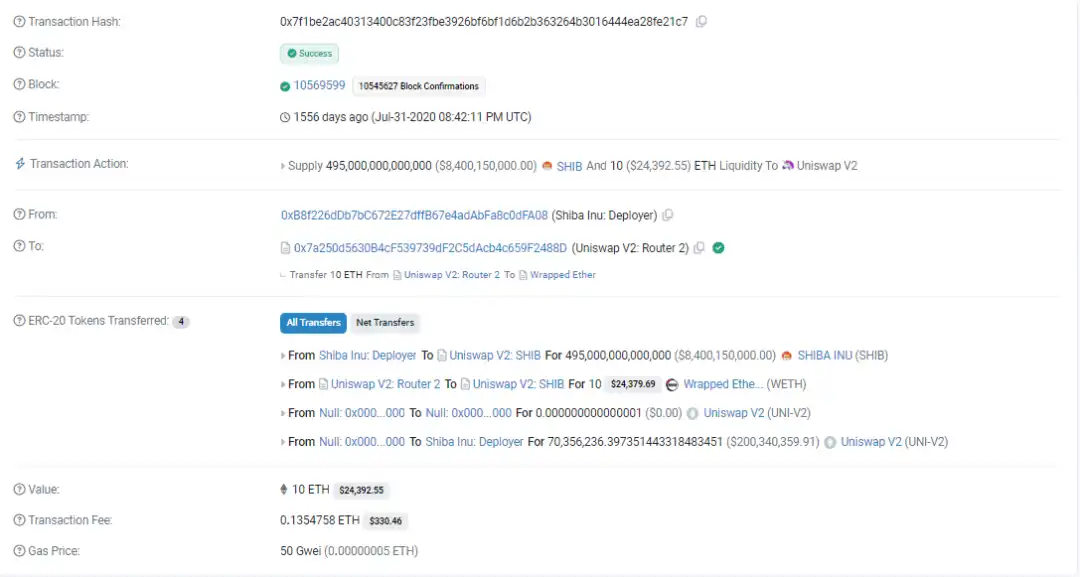 深入观察 Meme 的**市场诞生过程对于理解 Meme 的有**的帮助,特别是那些基于公链的 Meme,即使过去了几年,依然能够查看到最初的流动性建立。以 SHIB 为例,我们能够通过查看 SHIB 添加流动性池的初始交易,得以知道其市值的惊人增长。最初,SHIB 的市值仅相当于 20 个 ETH,当时的价值大约为 10K 美元,折算如今的 ETH 市价,SHIB 的初始市值也仅仅是 50K 美元。这对于一年之内市值增长至十亿级别的 Meme 来说,其财富增长效应无疑是极具吸引力和宣传价值的。