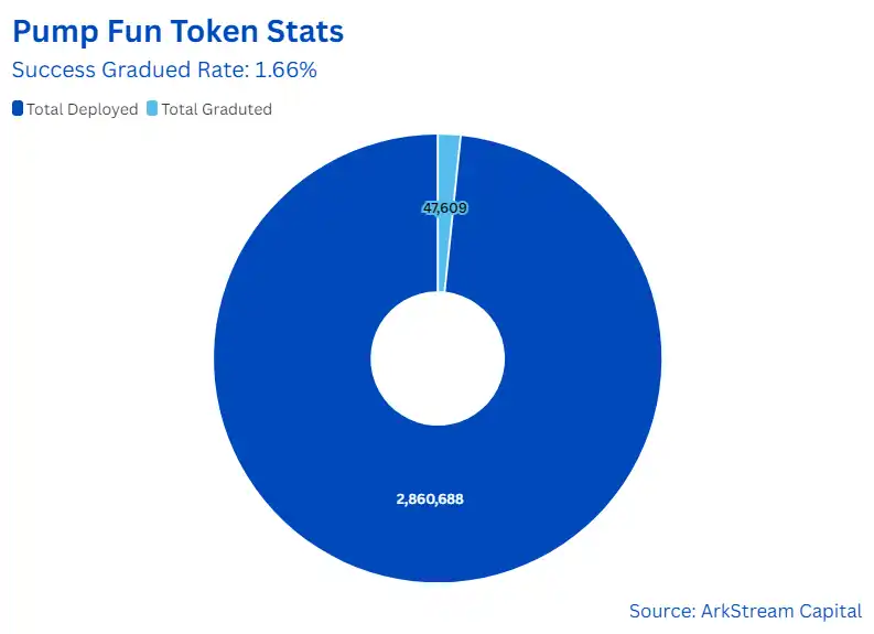 新晋 Meme 币涨幅和低成功率:Meme 市场中不断有新币种涌现,它们的涨幅有时甚至超过了 BTC 等主流加密货币。这表明 Meme **领域具有较高的波动性和投机机会。然而,在众多新 Meme 中,以 Pump fun 数据为例,成功发射的 Memes **不到 2%,当前市值维持在 1M 之上的** 0.23%,也就是说能够经受时间考验并存活下来的概率极为渺小。