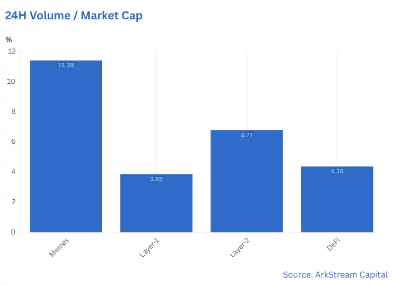 2、Meme 的日均换手率大约为 11%,相比之下,DeFi 为 5%,Layer2 为 7%,Layer1 的日均换手率是 4%,这一比例不仅凸显了 Meme 的高流动性,也表明用户对 Meme 的兴趣和交易**较高。