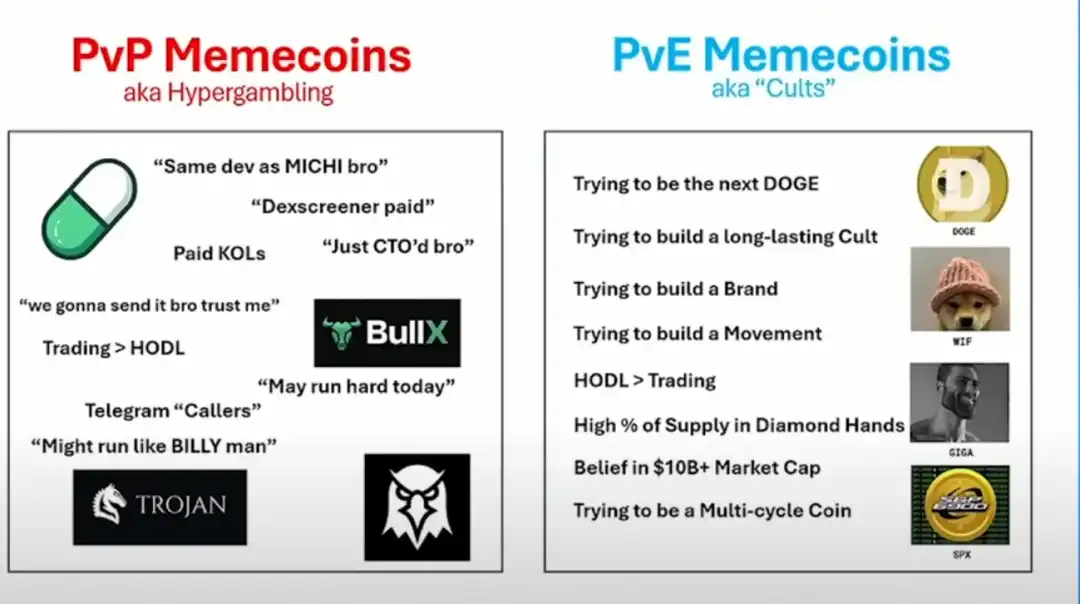 为此,我们认为 Murad 在 Meme Supercycle 的演讲里提出的 PvE Memecoins 非常形象生动,具体参考下面两图。