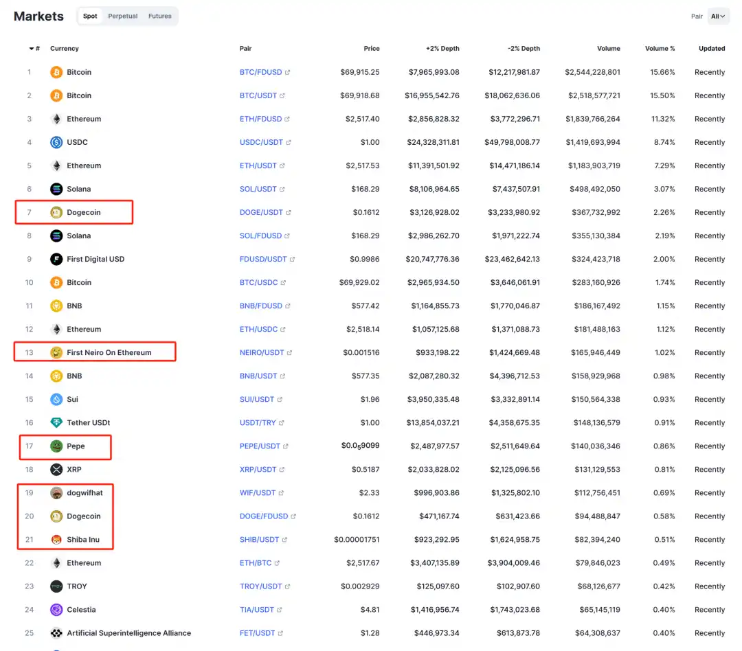 庞大的交易量和新用户:Meme 能够带来庞大的交易量并且有一群相对忠实的用户群体。由此,对于 CEX 而言,上市 Meme 币种可以成为吸引流量和用户的重要策略。以 Binance 现货市场为例,交易量排名前 30 的交易对中,有 20% 都是 Meme。