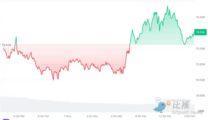 Coinmarketcap 数据显示,比特币早盘时回调至 74,500 美元低点,但在降息公告发布后,多头蓄力将价格推至接近 77,000 美元(76,943.12 美元)的历史新高。截至发稿时,比特币交易价格为 76,065.98 美元,24 小时涨幅为 0.6%。