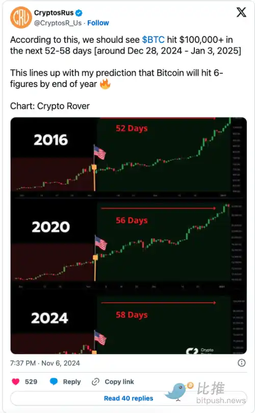 市场分析师 CryptosRus 表示,与之前的周期相比,比特币到 2025 年初可能会达到 10 万美元。