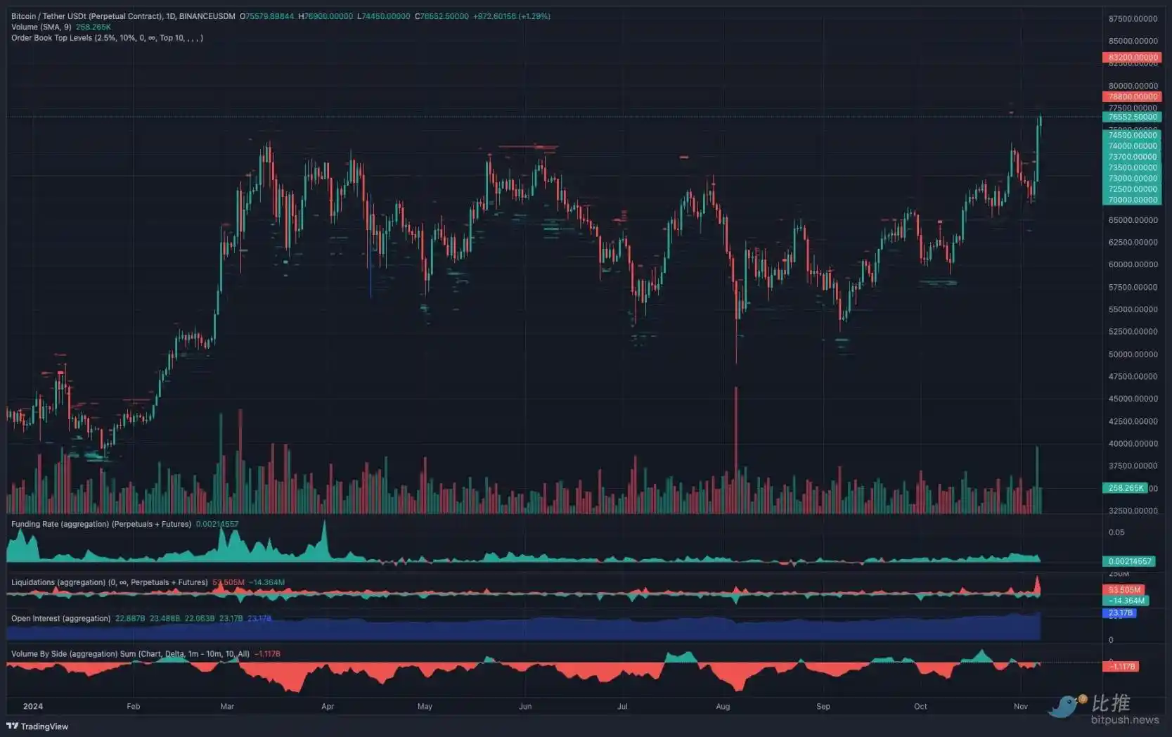 从技术指标来看,TRDR.io 日线图数据显示,从 2.5% 深度的订单簿结构来看,目前存在一个较大卖单挂单区位于 77,000 美元至 78,000 美元 之间,紧接着似乎一路畅通 ( 即缺乏明显的卖压 ) 直到 83,000 美元。