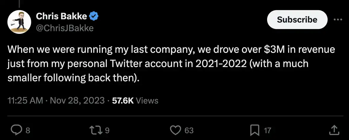 在我们经营上一家公司的时候,仅通过我的个人 Twitter 账户,在 2021-2022 年间就创造了超过 300 万美元的收入(当时我的粉丝还少很多)。