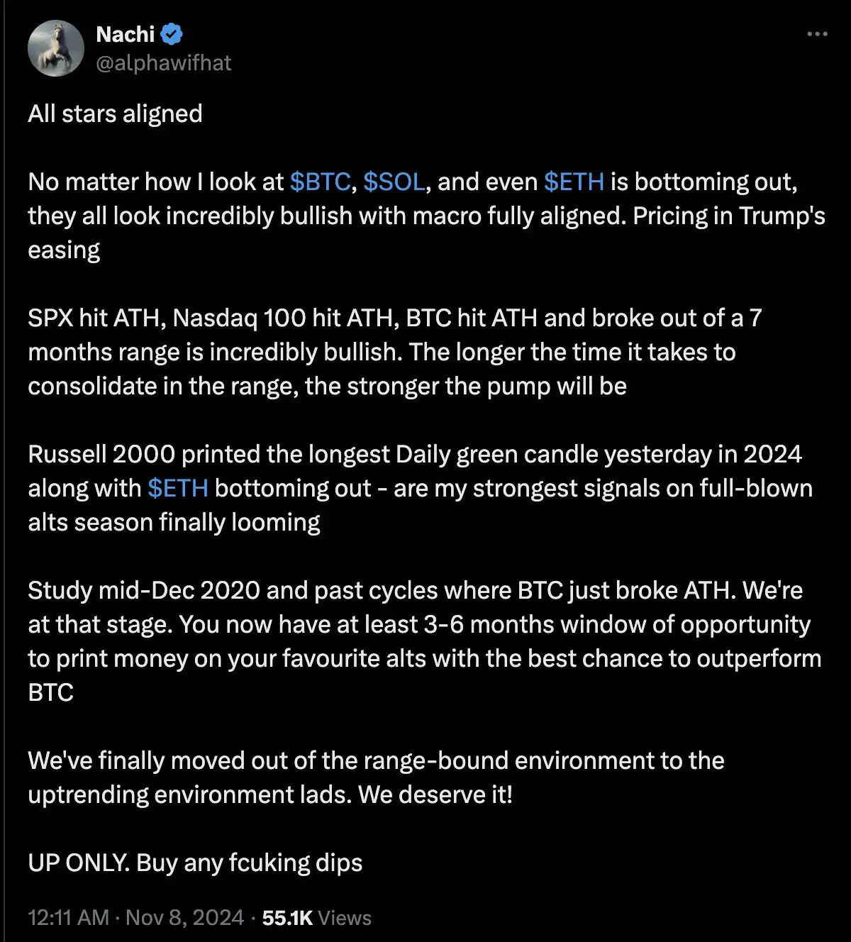 2. 宏观上**一致看涨 BTC ETH SOL,@alphawifhat