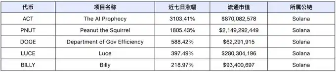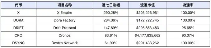 过去一周市场**涨幅前 5 名(未计入交易量过小的**和 meme 币),数据来源:Coinmarketcap