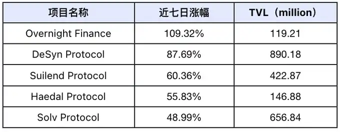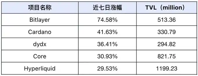 过去一周市场项目 TVL 涨幅前 5 名(未计入 TVL 较小的公项目,标准为 3000 万美元以上),数据来源:Defilama