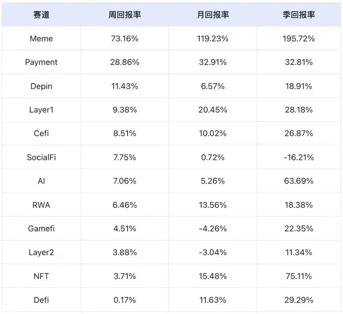 按周回报率统计,Meme 赛道表现**,而 Defi 赛道表现最差。