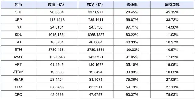 出现次数最多的题材是 L1s,上榜**情况如下(未计入交易量过小的**和 meme 币):