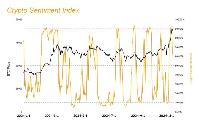 市场情绪指下降到 60%,较上周的 77% 有所的下降,市场情绪处于贪婪阶段。