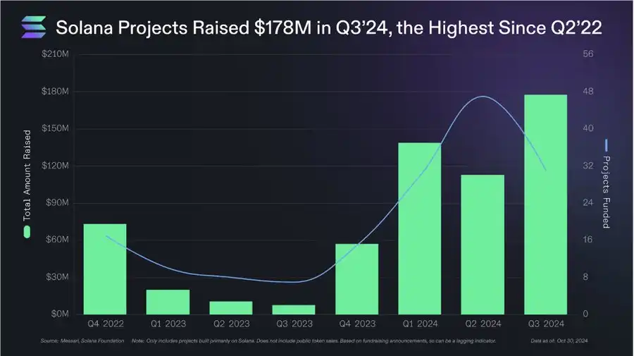 F.A.T. 的每个组成部分都是相互促进的:更多的创始人推出产品,更多的产品吸引用户,更多的用户推动更多资本的**化,更多的资本吸引更多的创始人。仅在 2024 年第三季度,Solana 原生团队就筹集了 1.78 亿美元。