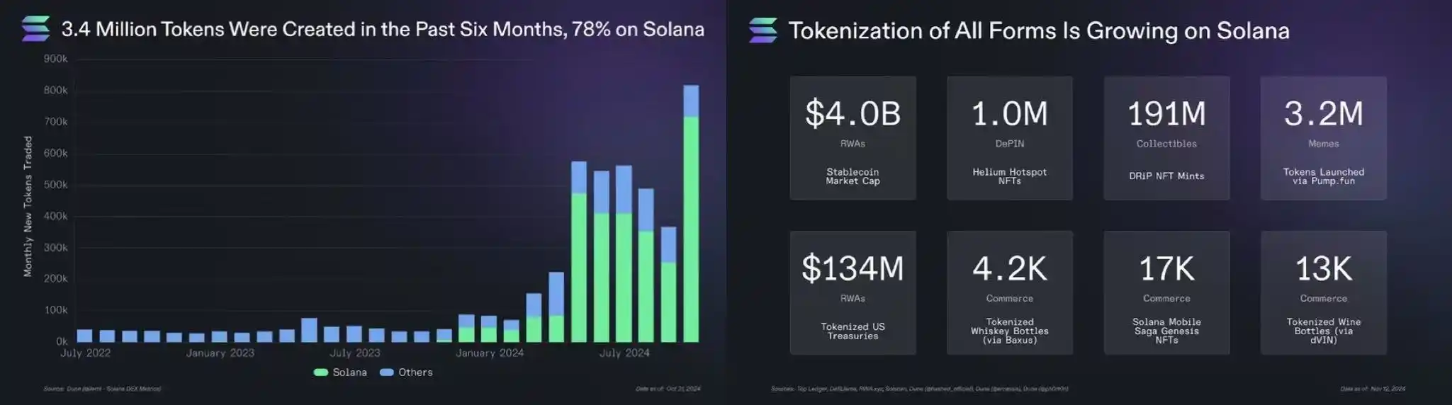TVL 是一个被动的、自我指涉的指标。像资本效率、交易量等主动指标更具指导性。更重要的**目标是:Solana 是互联网资产发布的**平台。在过去的 6 个月里,我们见证了 260 万个**的发布,占所有链总量的 78%。虽然 Memes 可能在公众意识中占据了较大份额,但它们并不是**在增长的事物。