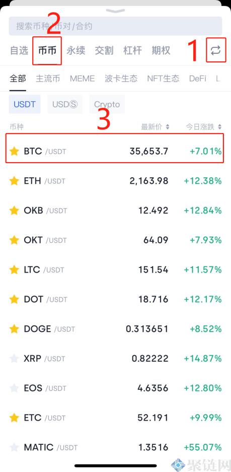 首先在欧交所官网( https://www.ouyi.icu/)下载欧交所手机版,在APP点击主页下方的导航栏交易,点击左上角硬币对框。