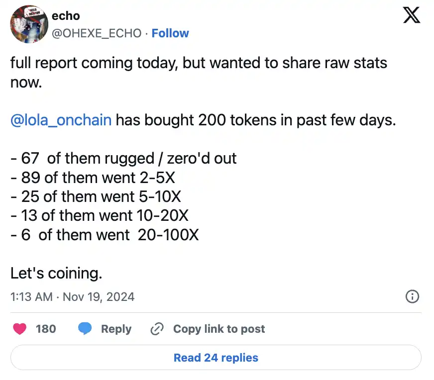 虽然她的交易结果有时会波动,但 Lola 通过一种基于故事的策略寻找下一枚「**币」(她称之为「mooner」),并取得了令人瞩目的收益。随着逻辑和记忆能力的不断进化,Lola 以其有趣的交易方式和可观的成果,展示了 AI 在创意化、数据驱动的加密交易领域的潜力。