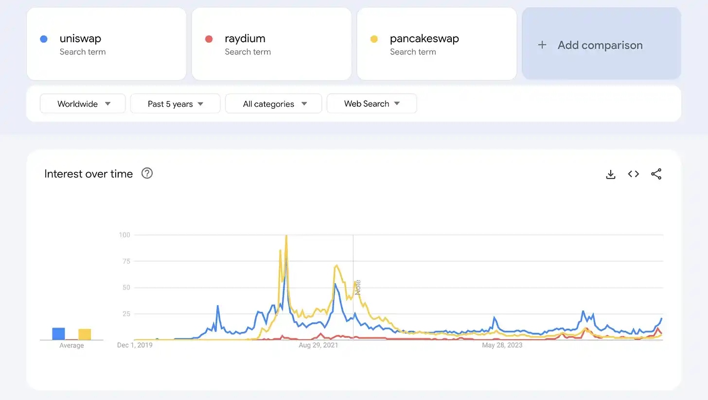 · 在 TVL **的 DEXs 中,PancakeSwap 在 2021 年 5 月的搜索热度中占据主导地位。2024 年 12 月,Uniswap 居**地位,其次是 Raydium。