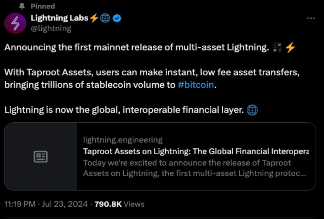 闪电网络上的稳定币有何不同?闪电网络上的稳定币优势解读!2024 年 7 月 23 日,Lightning Labs 发布了多资产闪电网络的**个主网版本,正式将 Taproot Assets 引入闪电网络。这一里程碑事件标志着稳定币正式在闪电网络上得到支持!